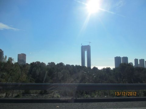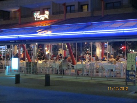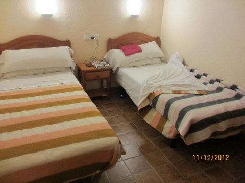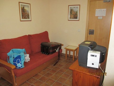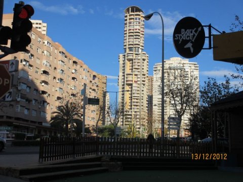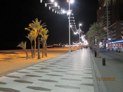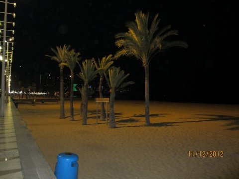 Soveværelset i lejligheden, meget hårde madrasser  Stuen, meget simpel, men ok til prisen  En udmærket bil, som stod i lufthavnen, da vi landede  I Benidorm er der mange høje hoteller  Stranden ser virkelig dejlig ud, også om aftenen  El Tunes, en rigtig god restaurent, hvor vi spiste en del