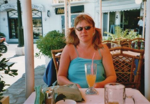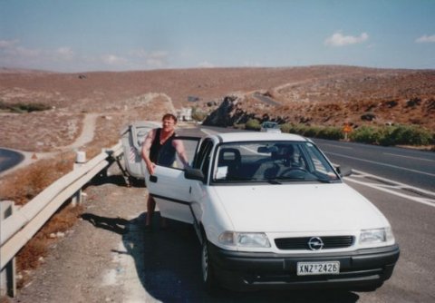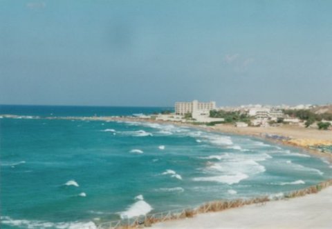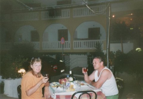 Vi skulle da have en tur i hestevogn  Vores lejlighed var udmærket  Men vi spiste jo altid ude, her hygger vi rigtig  Chrania's vartegn er fyret ved indsejlingen til havnen  Anne-Lise nyder en stille drink, eller er det bare appelsinjuice ?  Der var lidt bølger en gang imellem  Bilen vi havde lejet, det var faktisk rigtigt billigt at leje bil i 2000  Tager en slapper på stranden  Vi nyder en stille pilsner, inden vi skulle ud og sejle med en turbåd.