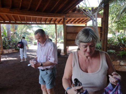 Vi skal lige have afiset vingerne, inden takeoff  Også på badeværelset var der pyntet op  Der var et dejligt poolområde  Hotelkatten, som gæsterne forsørgede  Virkelig flot Bourgonvilla  Sand fra Sahara's ørken er blæst helt herover  Hotelkatten, forlod slet ikke sit område  Ja, lidt kulturelle er vi da  Her er vi inde i kirken i La Oliva  er der masser af ledige pladser  Der er mange gedefarme på øen  En af mange flotte rundkørsler, det kunne vi godt lære af  Denne strand er blandt verdens 10 bedste, ifølge guiden  Vi mødte 2 hjemme fra vores by, det var rigtigt hyggeligt  Sød "lille" slange, i en dejlig dyrepark, vi besøgte  Det var nogle flotte mure der viste bynavnet  Også voksne laver sandslotte